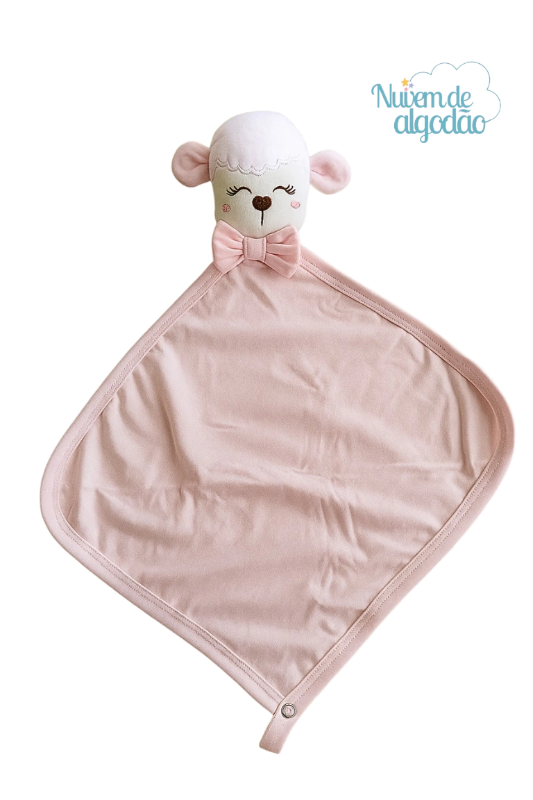 Com um rostinho bordado de ovelhinha sorridente, orelhinhas fofas e um charmoso laço rosa, essa naninha é uma companhia encantadora para o bebê dormir e se sentir acolhido.